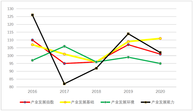 圖2“十三五”期間我國環(huán)保產(chǎn)業(yè)發(fā)展指數(shù)及一級指標(biāo)變化趨勢