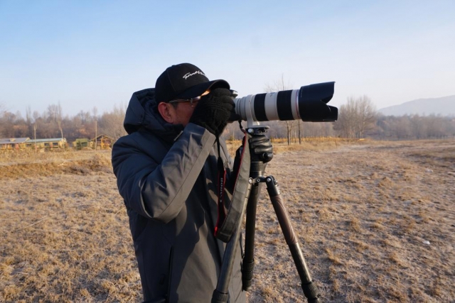 12月2日,攝影愛好者金祿正在化隆回族自治縣群科鎮(zhèn)黃河庫區(qū)拍攝大天鵝。新華社記者周盛盛 攝
