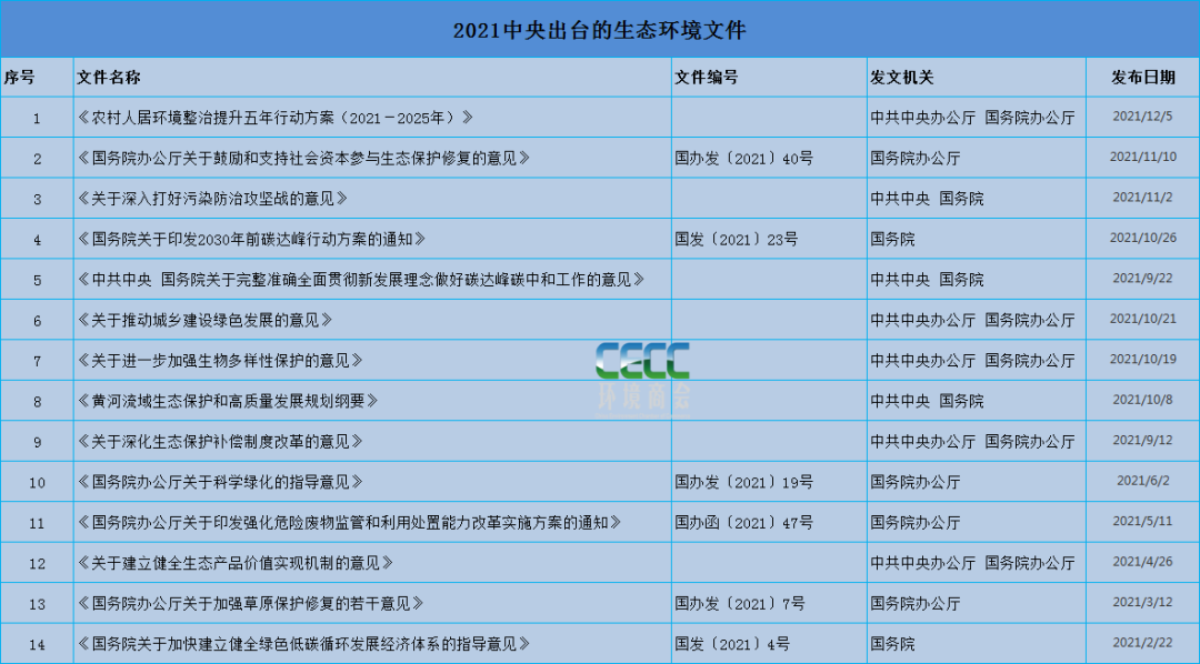 2021年是“十四五”開局年,也是碳中和元年,注定大風(fēng)不斷。一年來,中央有關(guān)生態(tài)環(huán)保相關(guān)的重要文件已經(jīng)陸續(xù)亮相,國家對今后一段時(shí)間減污降碳、綠色發(fā)展等重點(diǎn)工作進(jìn)行了系列部署。本文整理匯編了今年來中央出臺(tái)的生態(tài)環(huán)境相關(guān)文件,并摘取官方重點(diǎn)解讀內(nèi)容,以饗讀者,后續(xù)還將推出部委及地方生態(tài)環(huán)境文件匯編,敬請期待。根據(jù)商會(huì)不完全統(tǒng)計(jì),中央今年已經(jīng)出臺(tái)的生態(tài)環(huán)境相關(guān)文件共計(jì)14部,包括《關(guān)于深入打好污染防治攻堅(jiān)戰(zhàn)的意見》、《農(nóng)村人居環(huán)境整治提升五年行動(dòng)方案(2021-2025年)》、《黃河流域生態(tài)保護(hù)和高質(zhì)量發(fā)展規(guī)劃綱要》、《國務(wù)院關(guān)于加快建立健全綠色低碳循環(huán)發(fā)展經(jīng)濟(jì)體系的指導(dǎo)意見》等,其中也包括深刻影響社會(huì)經(jīng)濟(jì)發(fā)展的碳中和頂層文件《國務(wù)院關(guān)于印發(fā)2030年前碳達(dá)峰行動(dòng)方案的通知》《國務(wù)院關(guān)于印發(fā)2030年前碳達(dá)峰行動(dòng)方案的通知》等,關(guān)鍵詞為“綠色”“生態(tài)”“低碳”。