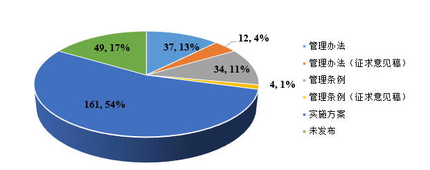 生活垃圾分類正由點(diǎn)到面逐步推開。據(jù)E20研究院觀察,截止到目前為止,297個(gè)地級以上城市其中有49個(gè)城市出臺垃圾分類管理辦法(其中12個(gè)城市處于征求意見稿階段),38個(gè)城市出臺垃圾分類管理?xiàng)l例(其中4個(gè)城市處于征求意見稿階段),161個(gè)城市公布垃圾分類實(shí)施方案,49個(gè)城市目前尚未公布相關(guān)法律法規(guī)制度,制度出臺城市占比達(dá)84%。