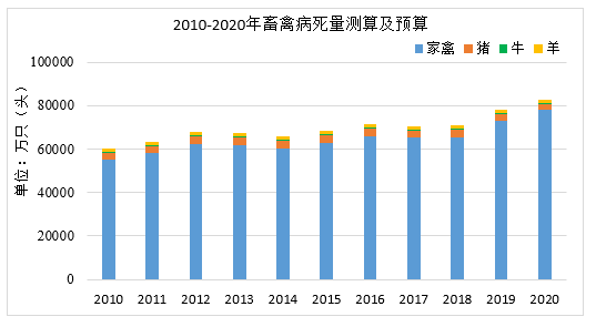 根據(jù)國家統(tǒng)計(jì)局、農(nóng)業(yè)農(nóng)村部公開畜禽出欄量/存欄量數(shù)據(jù)測算病死量。養(yǎng)殖場的畜禽死亡率一般在5%~10%之間,若按5%計(jì)算,我國畜禽死亡量從2010年6.03億頭(只)增長至2020年的8.25億頭(只),復(fù)合增長率3%,其中家禽類占據(jù)大部分。由于2018年“非洲豬瘟”疫情我國累積撲殺近100萬頭生豬,實(shí)際死亡量可能高于預(yù)測數(shù)值。死畜禽攜帶大量的病原微生物,不僅污染環(huán)境,對于人體健康和畜禽養(yǎng)殖業(yè)的健康發(fā)展也存在嚴(yán)重威脅。因此,對死畜禽進(jìn)行無害化處理是解決環(huán)境污染、實(shí)現(xiàn)畜牧業(yè)良性發(fā)展的必由之路。
