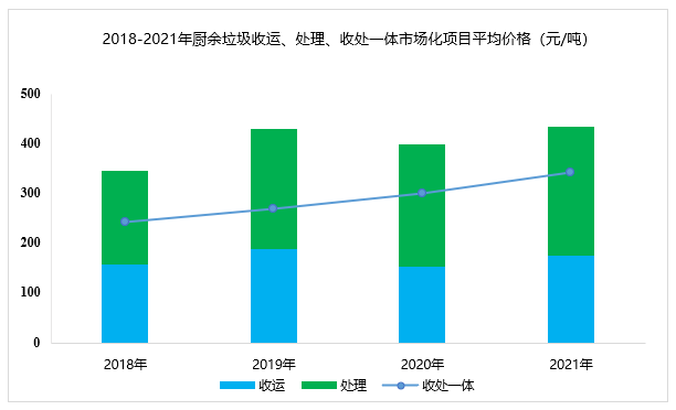 據(jù)E20數(shù)據(jù)庫統(tǒng)計(jì),廚余垃圾收運(yùn)市場的價(jià)格與地區(qū)相關(guān)性較大,平均收運(yùn)價(jià)格145元/噸,處理環(huán)節(jié)的平均中標(biāo)價(jià)為239元/噸,收處一體化價(jià)格為340元/噸,略高于餐廚垃圾的平均水平,并且呈逐年上漲的趨勢。因此,隨著垃圾分類工作的全面推進(jìn)及中標(biāo)價(jià)格的上漲,預(yù)計(jì)“十四五”期間廚余垃圾處理市場將迎來新一輪推動(dòng)。