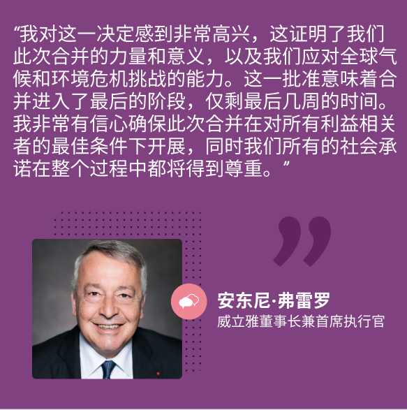 威立雅已與歐盟委員會(huì)進(jìn)行密切合作,以解決所有與競爭相關(guān)的問題:首先,在威立雅與第三方聯(lián)合體就為成立新蘇伊士而達(dá)成的商業(yè)協(xié)議中,剝離了大部分被歐盟委員會(huì)判定存在競爭問題的資產(chǎn)。這份商業(yè)協(xié)議與Meridiam、GIP 、 La Caisse des Dép?ts/CNP Assurances 組成的投資者聯(lián)合體簽署,協(xié)議內(nèi)容體現(xiàn)在威立雅和蘇伊士于2021年4月簽署的合并協(xié)議和2021年10月22 日簽署的購買協(xié)議中。合并完成后,新蘇伊士的營業(yè)收入接近70億歐元,包括蘇伊士在法國的水務(wù)與資源回收業(yè)務(wù),在意大利、中歐、非洲(包括摩洛哥)、中亞、印度、中國和澳大利亞的國際資產(chǎn),以及全球數(shù)字和環(huán)境業(yè)務(wù)。其次,為滿足歐盟委員會(huì)對(duì)某些其他市場的要求,威立雅還在工業(yè)水、移動(dòng)解決方案和特殊工業(yè)廢物領(lǐng)域給予了一些額外的補(bǔ)救措施。鑒于以19.85 歐元/每股的價(jià)格要約收購蘇伊士股份的唯一先決條件已經(jīng)獲得滿足,隨著收購要約的截止日期經(jīng)法國競爭管理局AMF確定為2022年1月7日威立雅和蘇伊士之間的合并進(jìn)入最后階段。據(jù)悉,目前擬議的合并已獲得18個(gè)國家和地區(qū)主管機(jī)構(gòu)中15個(gè)的批準(zhǔn),還有智利、英國和澳大利亞的競爭主管機(jī)構(gòu)仍在審查中。作為迄今為止全球環(huán)境領(lǐng)域最大的一筆交易,威立雅與蘇伊士的合并倍受矚目。