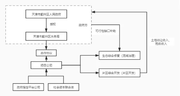 項(xiàng)目運(yùn)作模式和架構(gòu)。2019年5月,天津市薊州區(qū)人民政府發(fā)布《關(guān)于印發(fā)薊運(yùn)河(薊州段)全域水系治理、生態(tài)修復(fù)、環(huán)境提升及產(chǎn)業(yè)綜合開發(fā)EOD項(xiàng)目總體方案和市場(chǎng)化實(shí)施方案的通知》,對(duì)薊運(yùn)河(薊州段)EOD項(xiàng)目進(jìn)行總體部署。當(dāng)年8月,項(xiàng)目中標(biāo)候選人公示,中交天津航道局有限公司、中交疏浚(集團(tuán))股份有限公司、中交生態(tài)環(huán)保投資有限公司、中交第四航務(wù)工程勘察設(shè)計(jì)院有限公司與中交(天津)生態(tài)環(huán)保設(shè)計(jì)研究院有限公司聯(lián)合體為本項(xiàng)目的第一中標(biāo)候選人,項(xiàng)目工期為20年,中標(biāo)額約為65億元。該項(xiàng)目目前已順利確定社會(huì)資本方,已進(jìn)入項(xiàng)目執(zhí)行階段。