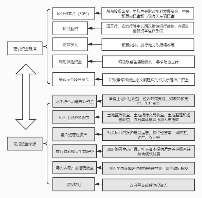 對(duì)于公益性為主的生態(tài)修復(fù)項(xiàng)目,政府的支持是項(xiàng)目推進(jìn)、價(jià)值實(shí)現(xiàn)的基礎(chǔ)。在本項(xiàng)目中,政府方做好了組織領(lǐng)導(dǎo),同時(shí)健全了項(xiàng)目統(tǒng)籌協(xié)調(diào)機(jī)制,在前期工作方面設(shè)計(jì)了完備的項(xiàng)目實(shí)施方案,對(duì)本項(xiàng)目進(jìn)行了總體部署及具體規(guī)定;在建設(shè)資金籌措方面,爭(zhēng)取中央地方專項(xiàng)資金,同時(shí)安排財(cái)政投入,為項(xiàng)目融資落地奠定良好基礎(chǔ);在回報(bào)來源方面,拓展了生態(tài)產(chǎn)品價(jià)值實(shí)現(xiàn)模式,不僅通過水系治理專項(xiàng)資金對(duì)社會(huì)資本予以補(bǔ)助,還允許社會(huì)資本按比例分享土地增值收益,通過土地增值收益、經(jīng)營性資產(chǎn)盤活等方式促進(jìn)項(xiàng)目生態(tài)價(jià)值實(shí)現(xiàn),更通過股權(quán)轉(zhuǎn)讓方式為社會(huì)資本退出提供了具體路徑,對(duì)社會(huì)資本的收益提供了一定程度的保障,也創(chuàng)新了生態(tài)保護(hù)修復(fù)與資源開發(fā)模式。