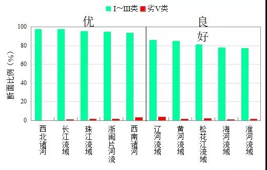 圖4 1-11月七大流域和西南、西北諸河及浙閩片河流水質(zhì)類(lèi)別比例
