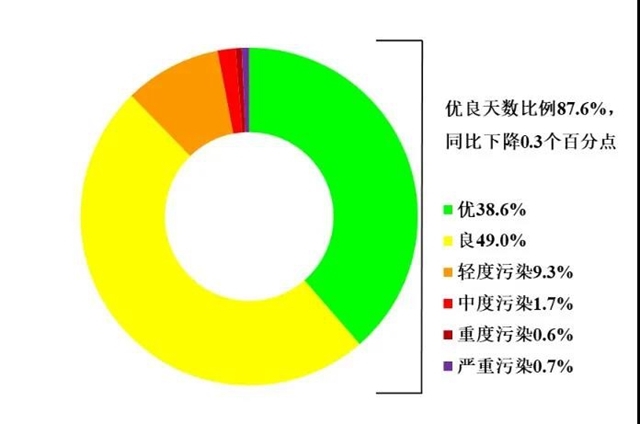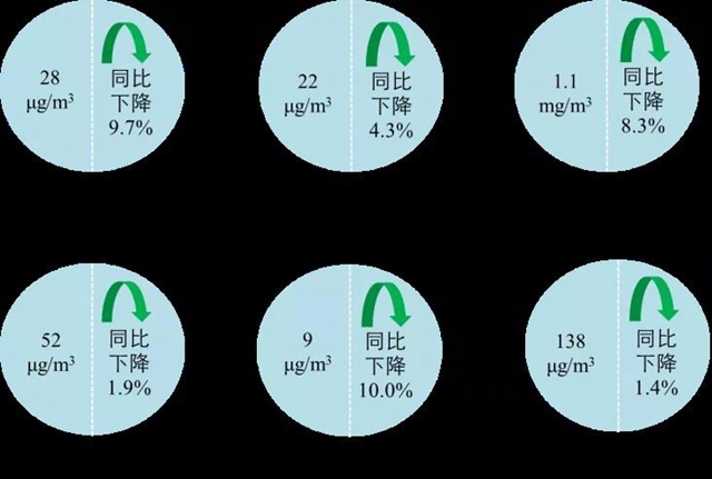 1-11月,全國(guó)339個(gè)地級(jí)及以上城市平均優(yōu)良天數(shù)比例為87.6%,同比下降0.3個(gè)百分點(diǎn);PM2.5平均濃度為28微克/立方米,同比下降9.7%;PM10平均濃度為52微克/立方米,同比下降1.9%;O3平均濃度為138微克/立方米,同比下降1.4%;SO2平均濃度為9微克/立方米,同比下降10.0%;NO2平均濃度為22微克/立方米,同比下降4.3%;CO平均濃度為1.1毫克/立方米,同比下降8.3%。