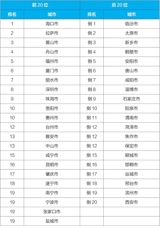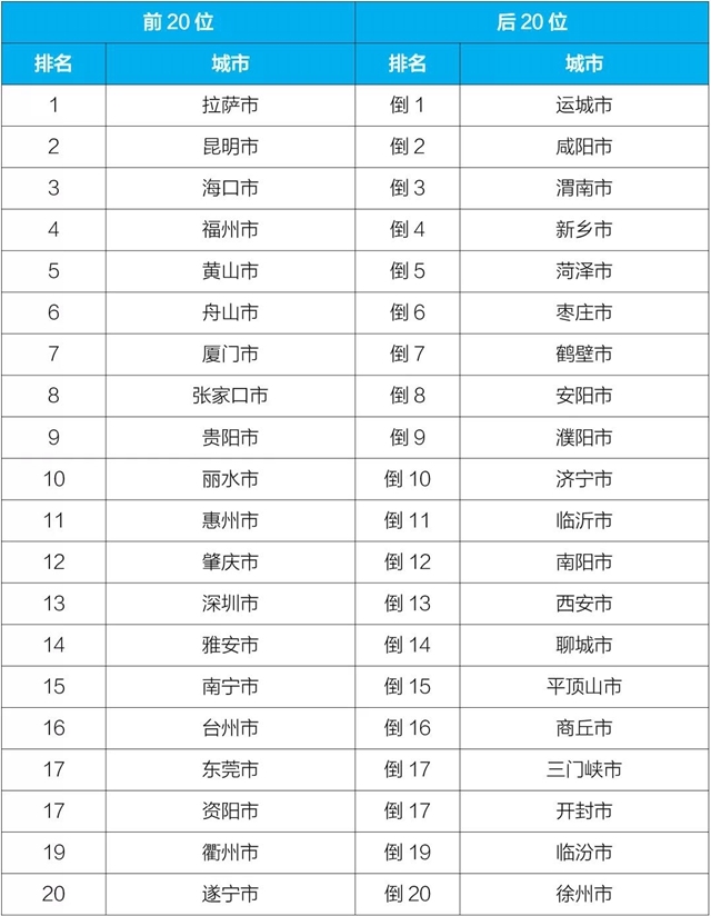 11月,168個(gè)重點(diǎn)城市中,拉薩、昆明和??诘?0個(gè)城市空氣質(zhì)量相對(duì)較好(從第1名至第20名),運(yùn)城、咸陽(yáng)、渭南等20個(gè)城市空氣質(zhì)量相對(duì)較差(從倒數(shù)第1名至倒數(shù)第20名),見(jiàn)附表3。