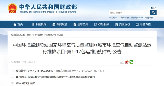 從11月22日,國家財(cái)政部公布的中國環(huán)境監(jiān)測(cè)總站國家環(huán)境空氣質(zhì)量監(jiān)測(cè)網(wǎng)城市環(huán)境空氣自動(dòng)監(jiān)測(cè)站運(yùn)行維護(hù)項(xiàng)目第1-17包運(yùn)維服務(wù)中標(biāo)公告重可以看出,共有10家企業(yè)中標(biāo),7家企業(yè)連拿兩包。其中,安徽藍(lán)盾光電子股份有限公司中標(biāo)金額最高,中標(biāo)了第3包和第5包,中標(biāo)金額分別為1942.128萬元和1940.328萬元。其次是廈門隆力德環(huán)境技術(shù)開發(fā)有限公司中標(biāo)了第1包和第4包,中標(biāo)金額分別為1815.9156萬元和1918.08萬元。