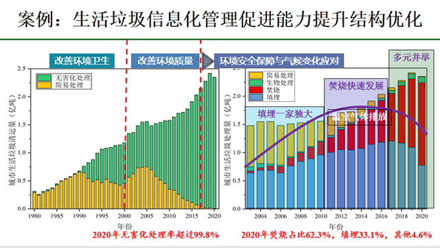 劉建國(guó)提到,我國(guó)城市垃圾治理從過去簡(jiǎn)單處理來(lái)改善環(huán)境衛(wèi)生到改善環(huán)境質(zhì)量再到環(huán)境安全保障與氣候變化應(yīng)對(duì)的新階段。2020年無(wú)害化處理率超過99.8%,但這不是說相當(dāng)于100分考了99.8分,而是100個(gè)人當(dāng)中有99.8個(gè)人超過了60分,其實(shí)還有很大進(jìn)步空間。2020年,城市生活垃圾焚燒占比62.3%,填埋33.1%,其他4.6%。垃圾無(wú)害化處理經(jīng)過了填埋一家獨(dú)大、焚燒快速發(fā)展到多元并舉的過程,整個(gè)處理系統(tǒng)的結(jié)構(gòu)在不斷優(yōu)化。
