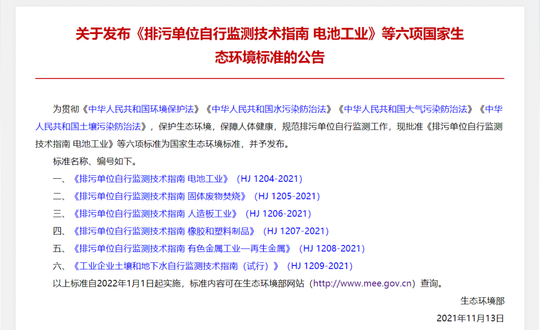 《排污單位自行監(jiān)測技術(shù)指南 電池工業(yè)》等六項(xiàng)國家生態(tài)環(huán)境標(biāo)準(zhǔn)