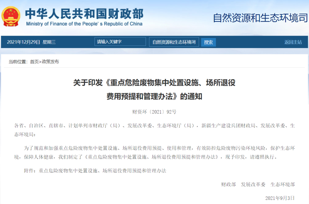 重點(diǎn)危險廢物集中處置設(shè)施、場所退役費(fèi)用預(yù)提和管理辦法