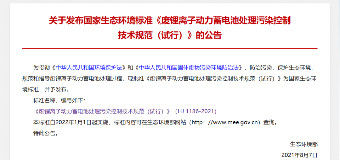 廢鋰離子動力蓄電池處理污染控制技術(shù)規(guī)范(試行)