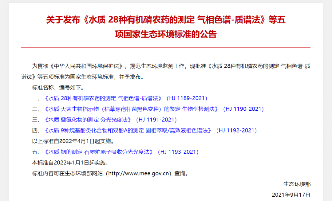 《水質(zhì) 28種有機(jī)磷農(nóng)藥的測定 氣相色譜-質(zhì)譜法》等五項(xiàng)國家生態(tài)環(huán)境標(biāo)準(zhǔn)