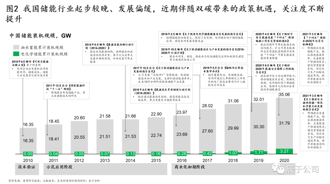 我國(guó)在儲(chǔ)能產(chǎn)業(yè)的戰(zhàn)略布局開始于2005年出臺(tái)的《可再生能源發(fā)展指導(dǎo)目錄》。經(jīng)過十多年的發(fā)展,目前儲(chǔ)能方面的政策已日趨完善,儲(chǔ)能發(fā)展已從研發(fā)示范向規(guī)?;?、市場(chǎng)化應(yīng)用轉(zhuǎn)變。