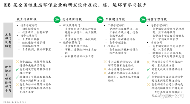 我們也發(fā)現(xiàn),很多生態(tài)環(huán)保企業(yè)的“投技建運(yùn)”存在脫節(jié),“技”在“投、建、運(yùn)”等環(huán)節(jié)的參與度不高,未給與充分的專(zhuān)業(yè)支持,不論是投資論證過(guò)程中的技術(shù)方案編制、還是工程建設(shè)階段的技術(shù)質(zhì)量驗(yàn)收、關(guān)鍵設(shè)備驗(yàn)收以及工藝技術(shù)指導(dǎo)等,仍有相關(guān)工作要做(見(jiàn)圖8)。近年來(lái)隨著國(guó)內(nèi)環(huán)保企業(yè)規(guī)模迅速擴(kuò)張,這些問(wèn)題似乎變得越來(lái)越嚴(yán)重。
