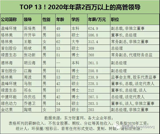 ▼年薪過(guò)200萬(wàn)的13位上市環(huán)保企業(yè)高管