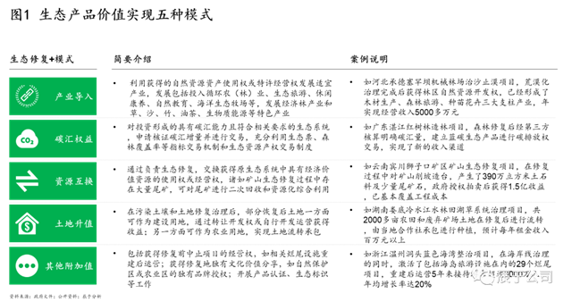 從以往案例來看,生態(tài)產(chǎn)品價值實現(xiàn)的路徑往往是以“生態(tài)修復+XXXX”的模式,具體包括“+產(chǎn)業(yè)導入”、“+碳匯權(quán)益”、“+資源互換”、“+土地升值”和“+其他附加值”五類(見圖1)。