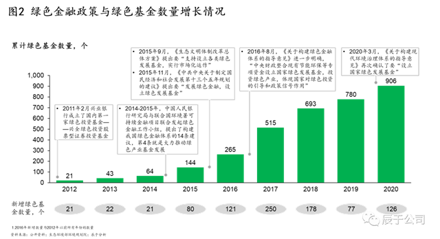 綠色金融是近年來行業(yè)發(fā)展的熱詞,包括綠色基金、綠色信貸、綠色債券、綠色保險等多種金融工具。以綠色基金為例,十三五期間先后發(fā)布了多個政策推動綠色產(chǎn)業(yè)基金發(fā)展,全國綠色基金的數(shù)量也增加了762個(見圖2)。其中2020年揭牌成立的國家綠色發(fā)展基金是生態(tài)環(huán)境保護領(lǐng)域第一個國家級政府投資基金,被認為是生態(tài)環(huán)境保護投融資機制改革取得歷史性突破和進展的標志。