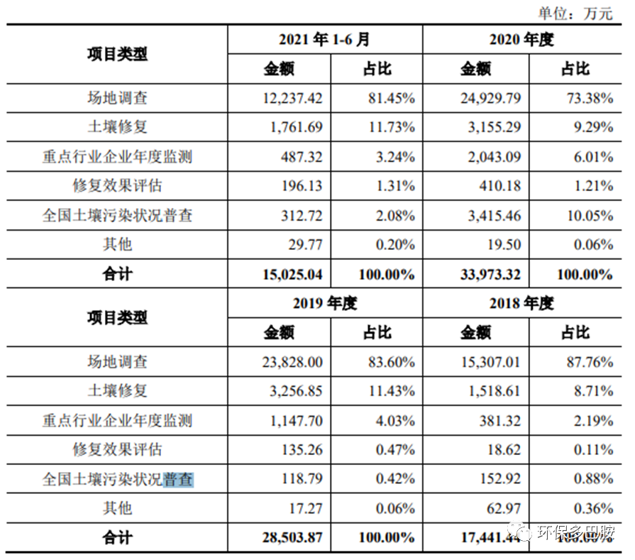 “報(bào)告期各期(2018-2021H1),公司土壤和地下水檢測業(yè)務(wù)收入分別為 17,441.44 萬元、28,503.87 萬元、33,973.32 萬元、15,025.04 萬元,占公司主營業(yè)務(wù)收入的比重分 別為 98.15%、95.69%、94.73%、91.81%?!?/span>