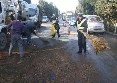 重油污路面,嚴重影響了市容市貌,交警叔叔也來幫忙清除了……