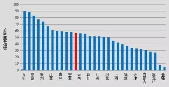 由于國家對危廢的管理實(shí)行“就近式、集中式”原則,亦使得危廢處理區(qū)域性特點(diǎn)明顯。2014年,工業(yè)危險(xiǎn)廢物綜合利用量較大的省份為山東639.8萬噸,占全國工業(yè)企業(yè)危險(xiǎn)廢物綜合利用量的31.0%;湖南232.5萬噸,占全國工業(yè)企業(yè)的11.3%;青海146.0萬噸,占全國工業(yè)企業(yè)的7.1%;云南137.1萬噸,占全國工業(yè)企業(yè)的6.6%;江蘇125.3萬噸,占全國工業(yè)企業(yè)的6.1%;全國工業(yè)危險(xiǎn)廢物綜合利用率為56.4%。共有11個(gè)省份工業(yè)危險(xiǎn)廢物綜合利用率超過全國平均水平,其中山東、湖南和安徽超過80%。下圖是2014年我國各地區(qū)工業(yè)危險(xiǎn)廢物綜合利用率: