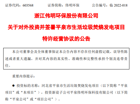 據(jù)悉,偉明環(huán)保作為聯(lián)合體牽頭人與上海寶達環(huán)境科技有限公司組成的聯(lián)合體于2022年1月被確認為該項目的中標社會資本。偉明環(huán)保負責投資、建設和運營平泉市生活垃圾焚燒發(fā)電特許經營項目,公司以自有資金不超過 9,000 萬元投資于本項目。