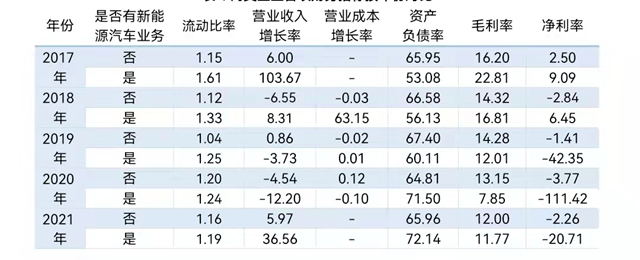 對(duì)數(shù)據(jù)結(jié)果進(jìn)行縱向比較,得出結(jié)論如下:沒有新能源汽車業(yè)務(wù)的上市公司的流動(dòng)比率圍繞1.1%波動(dòng),資產(chǎn)負(fù)債率圍繞65%波動(dòng),較為穩(wěn)定。毛利率為正說明企業(yè)收入為正,2018-2021年凈利率為負(fù)說明企業(yè)實(shí)際經(jīng)營(yíng)虧損。有新能源汽車業(yè)務(wù)的上市公司的流動(dòng)比率圍繞1.2%波動(dòng),資產(chǎn)負(fù)債率圍繞65%波動(dòng),較為穩(wěn)定。營(yíng)業(yè)成本增長(zhǎng)率2019年后基本為0,成本控制較好。毛利率為正說明企業(yè)收入為正,2019-2021年凈利率為負(fù)說明企業(yè)實(shí)際經(jīng)營(yíng)嚴(yán)重虧損。