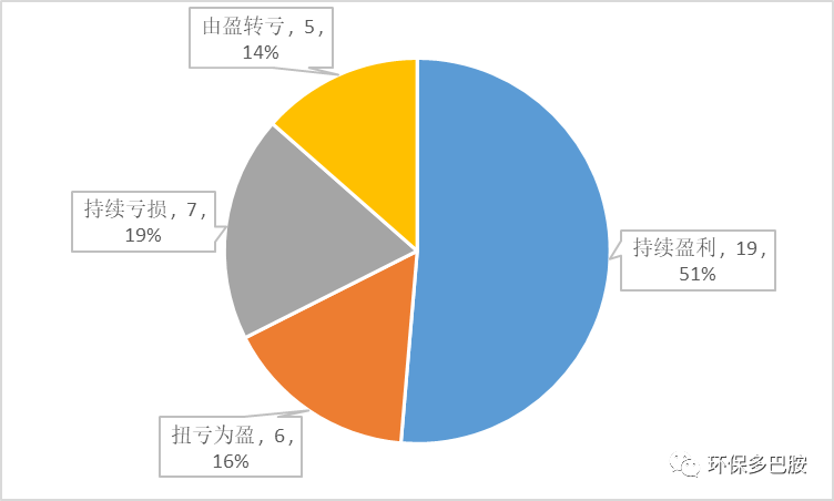 總的來看,總計(jì)37家上市公司提前交卷,其中持續(xù)盈利19家,扭虧為盈6家,持續(xù)虧損7家,由盈轉(zhuǎn)虧5家。按照160家環(huán)保上市公司樣本數(shù)量統(tǒng)計(jì),