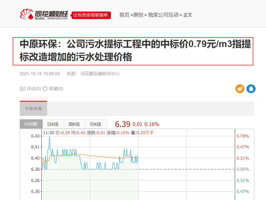 3、中原環(huán)保:公司污水提標工程中的中標價0.79元/m3指提標改造增加的污水處理價格,同花順金融研究中心,2021-10-15