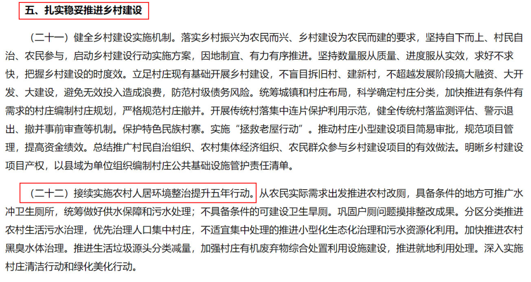今年的中央一號文件,已經(jīng)是21世紀以來第19個指導(dǎo)“三農(nóng)”工作的中央一號文件。中央一號文件中,對2022年的“三農(nóng)”工作做出了全面部署,其中包括糧食生產(chǎn)、現(xiàn)代農(nóng)業(yè)、防止規(guī)模性返貧、鄉(xiāng)村產(chǎn)業(yè)、鄉(xiāng)村建設(shè)、鄉(xiāng)村治理、保障機制,以及黨的領(lǐng)導(dǎo)等8個章節(jié)。這里面,與環(huán)保產(chǎn)業(yè)關(guān)系最密切的就是第5章“扎實穩(wěn)妥推進鄉(xiāng)村建設(shè)”的第二十二節(jié)“接續(xù)實施農(nóng)村人居環(huán)境整治提升五年行動”。 ·從農(nóng)民實際需求出發(fā)推進農(nóng)村改廁,具備條件的地方可推廣水沖衛(wèi)生廁所,統(tǒng)籌做好供水保障和污水處理;不具備條件的可建設(shè)衛(wèi)生旱廁。