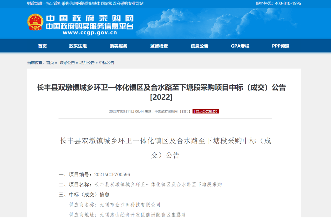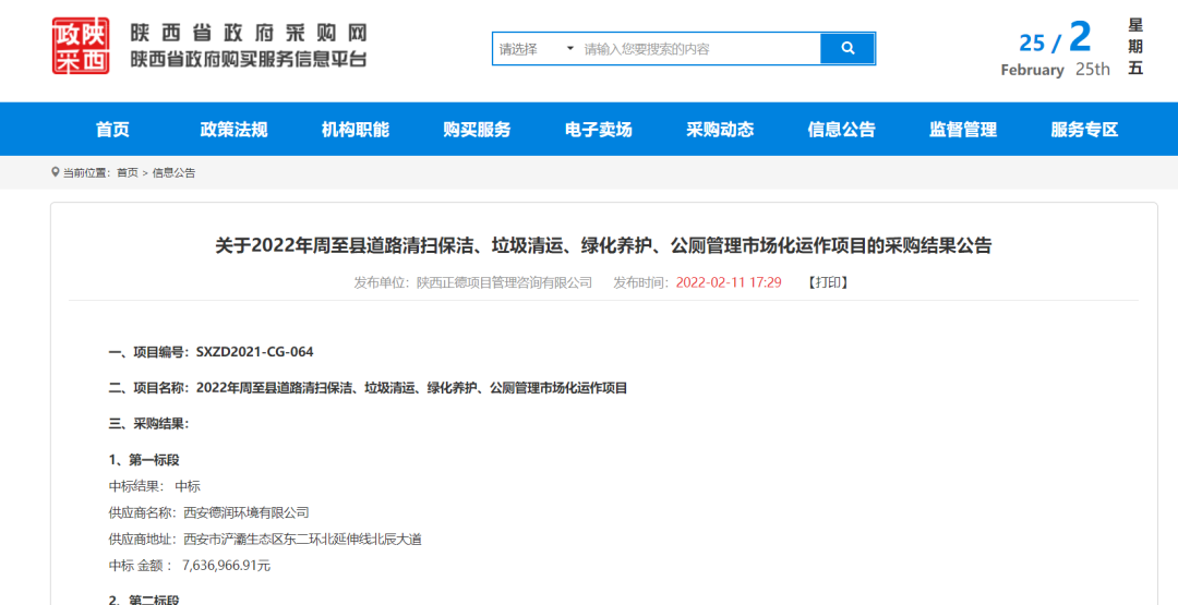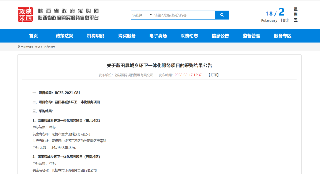 金沙田六天接連斬獲3個環(huán)衛(wèi)項目,總金額達(dá)4.41億元! 來源 | 環(huán)衛(wèi)科技網(wǎng)環(huán)衛(wèi)科技網(wǎng)訊,金沙田六天接連斬獲3個環(huán)衛(wèi)項目,總金額達(dá)4.41億元!藍(lán)田縣城鄉(xiāng)環(huán)衛(wèi)一體化服務(wù)項目2月17日,陜西省政府采購網(wǎng)發(fā)布藍(lán)田縣城鄉(xiāng)環(huán)衛(wèi)一體化服務(wù)項目的采購結(jié)果公告。金沙田中標(biāo)藍(lán)田縣城鄉(xiāng)環(huán)衛(wèi)一體化服務(wù)項目(東北片區(qū))標(biāo)段,中標(biāo)金額總計約3.48億元,特許經(jīng)營期10年,其中包括1年建設(shè)期。該標(biāo)段范圍覆蓋藍(lán)關(guān)街道辦(北環(huán)路以北部分)、三里鎮(zhèn)區(qū)、華胥鎮(zhèn)區(qū)及洩湖鎮(zhèn)區(qū)(包含藍(lán)田縣工業(yè)園、西北家具工業(yè)園)。未來,金沙田科技將負(fù)責(zé)提供城區(qū)道路清掃保潔、垃圾收轉(zhuǎn)運、公廁和文明驛站運營、綠化養(yǎng)護、垃圾分類、環(huán)衛(wèi)智慧平臺等環(huán)衛(wèi)服務(wù)。周至縣道路清掃保潔、垃圾清運、綠化養(yǎng)護、公廁管理市場化運作項目2月11日,陜西省政府采購網(wǎng)發(fā)布周至縣道路清掃保潔、垃圾清運、綠化養(yǎng)護、公廁管理市場化運作項目采購結(jié)果公告,第二標(biāo)段中標(biāo)方為金沙田,中標(biāo)金額為460.5萬元,服務(wù)期限1年。長豐縣雙墩鎮(zhèn)城鄉(xiāng)環(huán)衛(wèi)一體化鎮(zhèn)區(qū)及合水路至下塘段采購項目2月11日,中國政府采購網(wǎng)發(fā)布長豐縣雙墩鎮(zhèn)城鄉(xiāng)環(huán)衛(wèi)一體化鎮(zhèn)區(qū)及合水路至下塘段采購項目中標(biāo)(成交)公告,中標(biāo)方為金沙田,中標(biāo)金額為8792.5萬元,服務(wù)期限1年,合同1年1簽,續(xù)簽不超過2年。1、雙墩鎮(zhèn)鎮(zhèn)區(qū)范圍內(nèi)的市政道路、重要道路及道路兩側(cè)的清掃保潔;2、雙墩鎮(zhèn)鎮(zhèn)區(qū)范圍內(nèi)街道、公園、游園、廣場等衛(wèi)生保潔;3、本次招標(biāo)范圍內(nèi)所有生活垃圾收集、轉(zhuǎn)運至陶樓合肥長豐皖能環(huán)保電力有限公司;4、雙墩鎮(zhèn)鎮(zhèn)區(qū)范圍內(nèi)繁華商業(yè)區(qū)、人群密集街道及主要交通道路路口文明勸導(dǎo)服務(wù);6、建立智慧環(huán)衛(wèi)信息管理系統(tǒng)平臺。接下來的3月份,金沙田又將會有哪些亮眼表現(xiàn)?來源 | 環(huán)衛(wèi)科技網(wǎng)