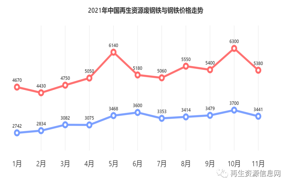 圖6 2021年我國(guó)再生資源廢鋼鐵與鋼鐵價(jià)格走勢(shì)圖