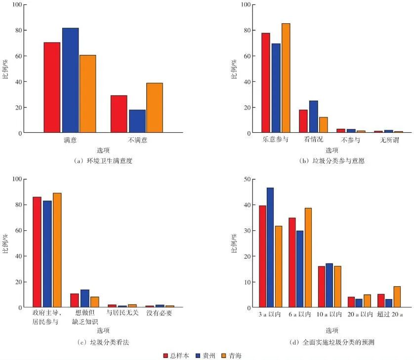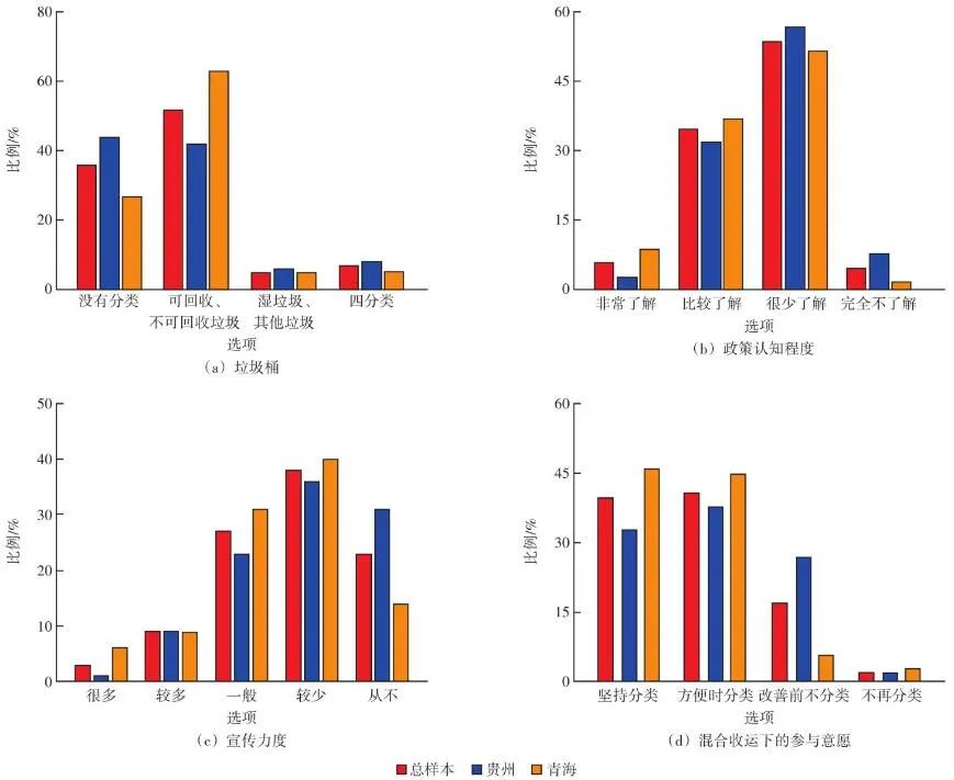 基于青海和貴州兩地的調(diào)查數(shù)據(jù)(共302份有效問卷),分析西部地區(qū)居民垃圾分類意愿及影響因素,發(fā)現(xiàn)環(huán)境衛(wèi)生滿意度為72%。78%的受訪者愿意參與分類,86%的受訪者支持“政府主導(dǎo),居民參與”,強(qiáng)制分類(72%)、濕垃圾破袋投放(68%)和定時定點(diǎn)投放(61%)3項(xiàng)措施的接受程度較高。分類不方便、設(shè)施不完善、宣傳力度不足、缺乏社會氛圍是阻礙居民垃圾分類的主要因素。建議構(gòu)建政府主導(dǎo)、多方參與的垃圾治理機(jī)制,提高垃圾桶配置率和覆蓋率,提高垃圾分類投放的便利性,采取針對性的宣傳策略,營造全民參與垃圾分類的社會氛圍。在采取多樣化的管理措施組合方式下,青海、貴州兩地分別側(cè)重加強(qiáng)強(qiáng)制型管理和引導(dǎo)型管理。