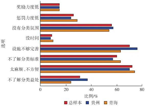 圖 4 實(shí)施垃圾分類的困難分析 完善配套設(shè)施是居民實(shí)施垃圾分類的硬件基礎(chǔ),但其所發(fā)揮的實(shí)際效果很大程度上取決于主觀因素,受政策宣傳的影響較大。調(diào)查對垃圾分類政策的了解情況,結(jié)果如圖4(b)所示,其選項(xiàng)包括“非常了解”“比較了解”“很少了解”和“完全不了解”,選擇率分別為6%、34%、55%、5%。60%的受訪者對相關(guān)政策的了解不充分,“非常了解”的受訪者不足一成,政策認(rèn)知水平較低。與青海樣本相比,政策認(rèn)知程度低的問題在貴州樣本中更突出[Sig.(雙側(cè))<0.05]。