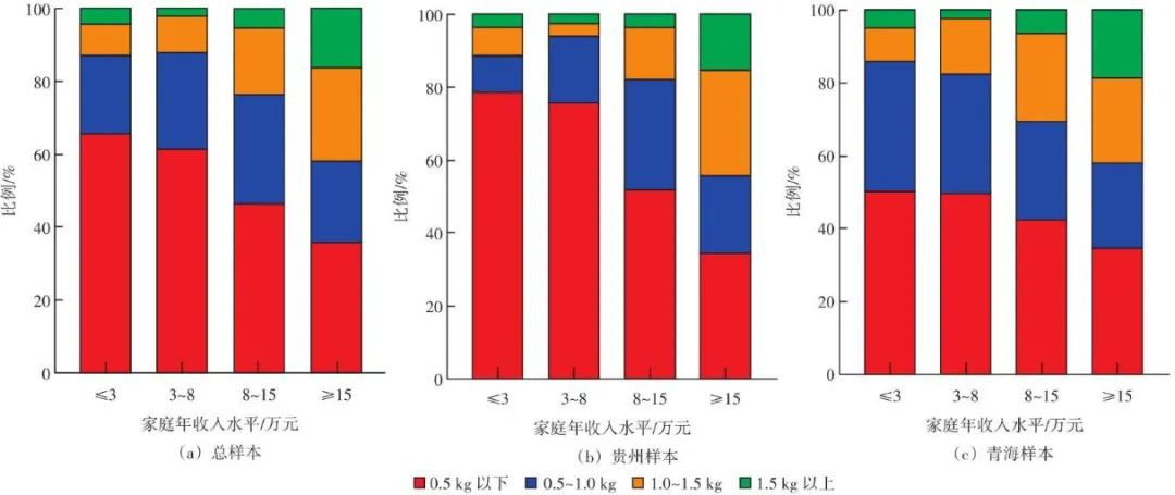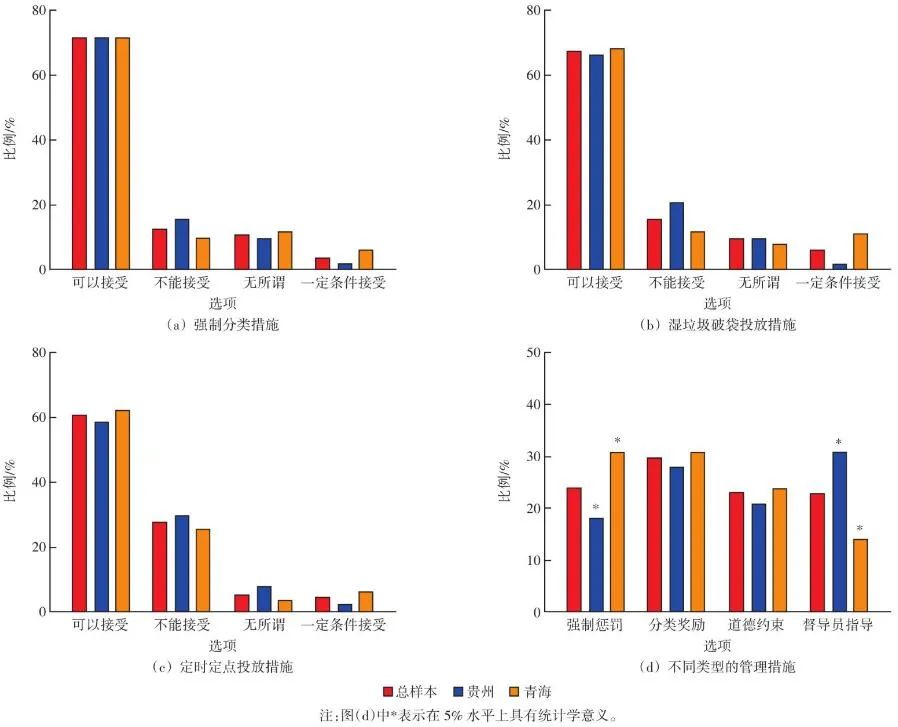 不同地區(qū)在垃圾分類管理模式的選擇上應(yīng)有所側(cè)重。以卡方檢驗(yàn)分析兩地受訪者對管理模式的選擇差異,見圖5(d),兩地樣本在“分類獎勵”和“道德約束”兩項(xiàng)的選擇差異不顯著,而“強(qiáng)制懲罰”和“督導(dǎo)員指導(dǎo)”兩項(xiàng)的選擇存在顯著差異,因此強(qiáng)制型和引導(dǎo)型管理的側(cè)重更值得關(guān)注。青海居民更傾向于選擇“強(qiáng)制懲罰”(P<0.05),可能因?yàn)榍嗪5沫h(huán)境衛(wèi)生壓力和居民參與意愿相對較高。同時選擇“懲罰力度較低”的比例相對較高(圖3),當(dāng)?shù)貞土P力度不足問題可能更突出,建議青海相對側(cè)重加強(qiáng)強(qiáng)制型管理。貴州居民更傾向于選擇“督導(dǎo)員指導(dǎo)”(P<0.05),貴州居民參與意愿和政策認(rèn)識水平相對較低,可能更需要督導(dǎo)員的專門指導(dǎo),建議貴州相對側(cè)重加強(qiáng)引導(dǎo)型管理。