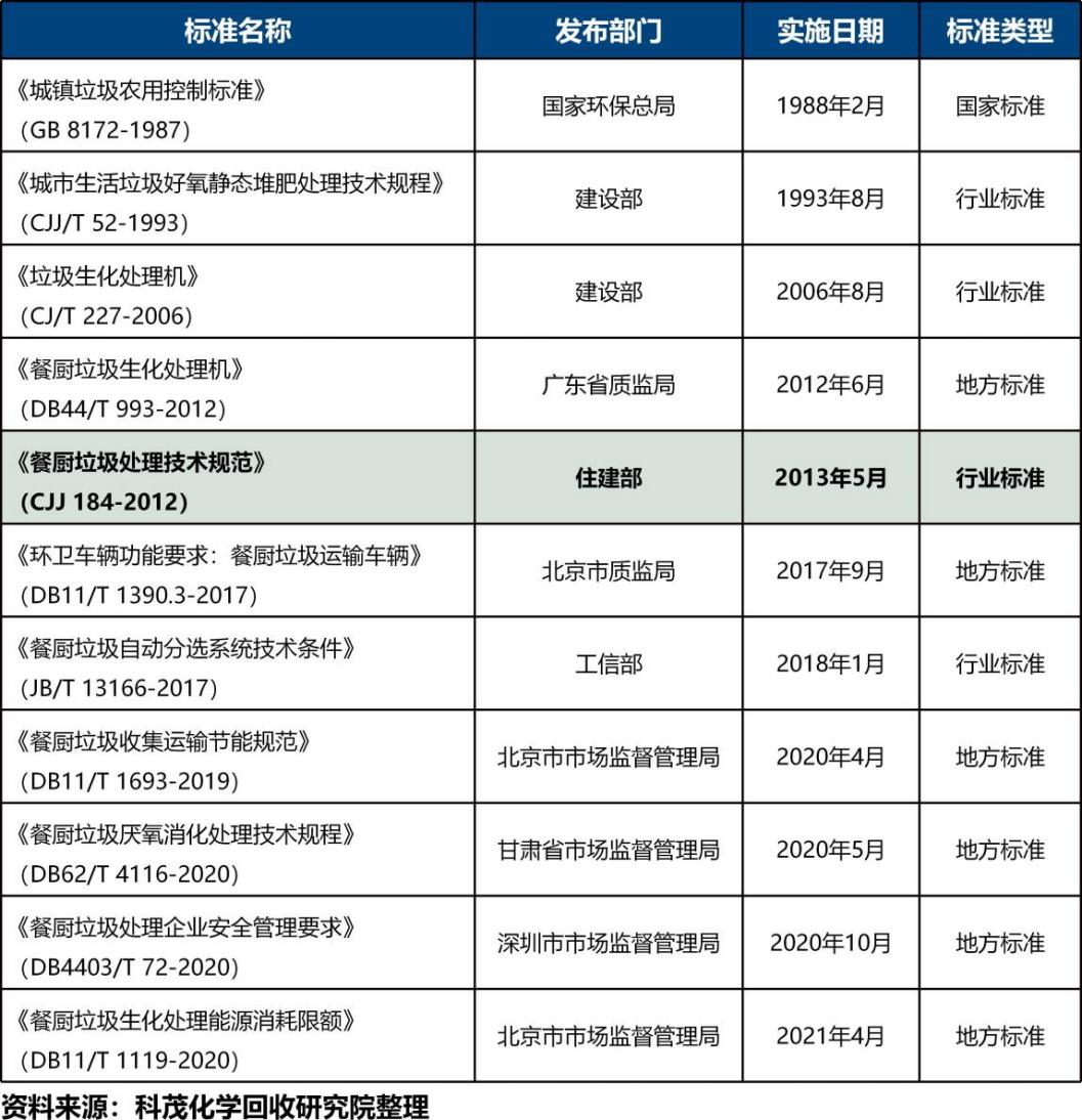 餐廚垃圾處理:2007年12月,住建部發(fā)布《餐廚垃圾處理技術規(guī)范》,針對餐廚垃圾的收集與運輸、廠址選擇、總體設計、餐廚垃圾計量接受輸送、餐廚垃圾處理工藝、輔助工程、工程施工與驗收等方面作出詳細規(guī)定。除此之外,還制定了一系列國家標準、行業(yè)標準和地方標準。