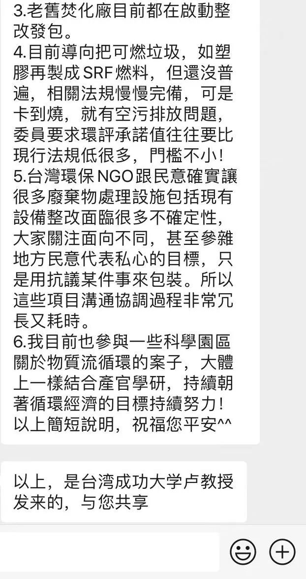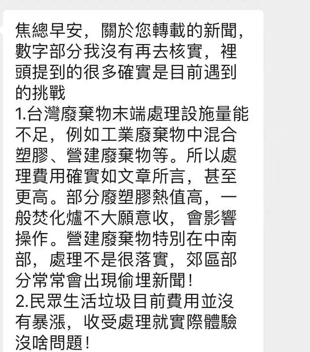 清氣團在發(fā)布了相關(guān)臺灣垃圾分類處置研究的文章后,也獲得臺灣當?shù)毓虖U同行的注意,并通過國內(nèi)某熱心同行老總,輾轉(zhuǎn)傳來相關(guān)回應(yīng)。