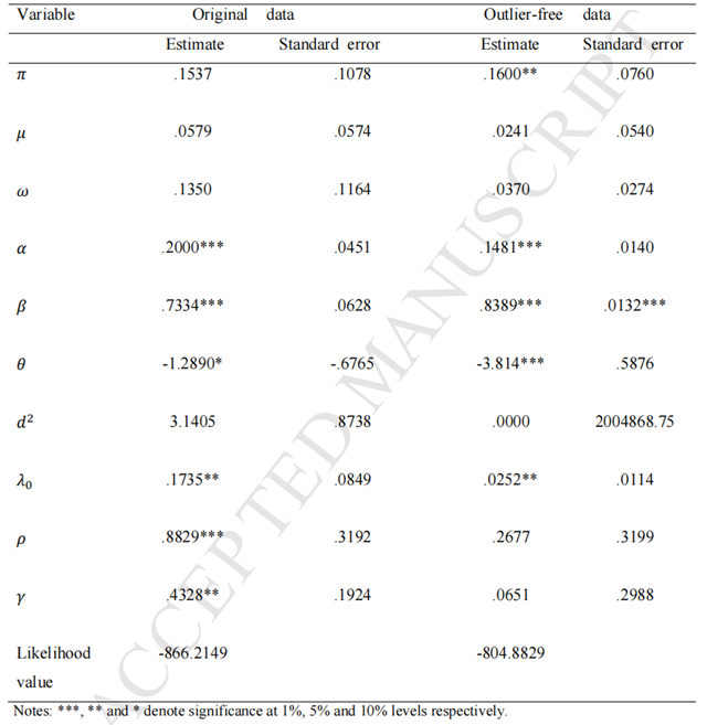 運(yùn)用GARCH-Jump模型識(shí)別EUA市場(chǎng)中的跳躍,結(jié)果如圖4。主要結(jié)論包括:(1)使用原始數(shù)據(jù)進(jìn)行估計(jì)時(shí)跳躍參數(shù)都顯著,證實(shí)了EUA市場(chǎng)跳躍的存在;(2)α+β的值表明EUA回報(bào)率波動(dòng)的高度持續(xù)性;(3)μ不顯著,反映EUA市場(chǎng)的當(dāng)前回報(bào)不受過(guò)去回報(bào)的影響,難以進(jìn)行短期預(yù)測(cè);(4)跳躍均值θ顯著為負(fù),表明由異常信息驅(qū)動(dòng)的跳躍行為對(duì)收益有負(fù)面影響;(5)跳躍方差d2的正系數(shù)顯著為正,表明由異常信息驅(qū)動(dòng)的波動(dòng)對(duì)EUA回報(bào)有正向影響;(6)跳躍強(qiáng)度系數(shù)()統(tǒng)計(jì)顯著,表明跳躍強(qiáng)度隨時(shí)間變化,ρ和γ值較高反映跳躍強(qiáng)度的持續(xù)性。