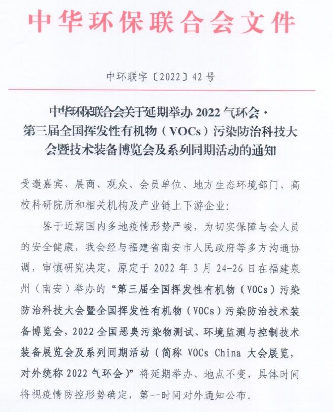 中華環(huán)保聯(lián)合會(huì)關(guān)于延期舉辦2022氣環(huán)會(huì)●第三屆全國(guó)揮發(fā)性有機(jī)物( VOCs )污染防治科技大會(huì)暨技術(shù)裝備博覽會(huì)及系列同期活動(dòng)的通知