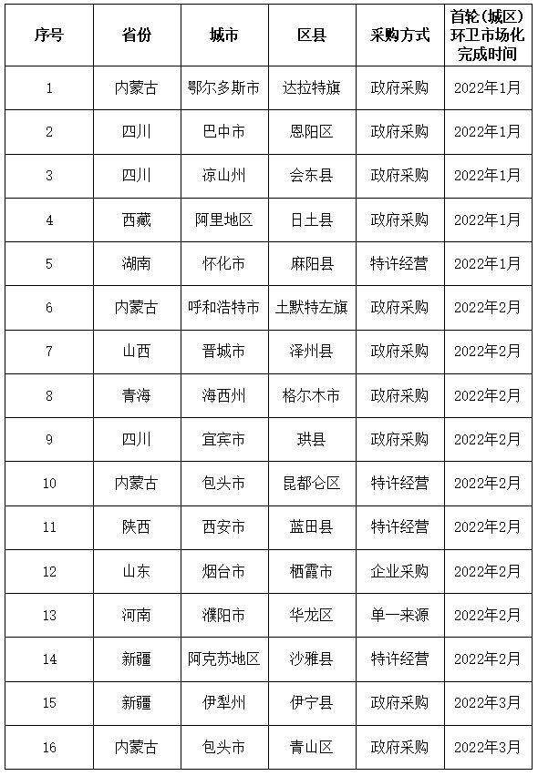 截止2021年12月31日,全國(guó)完成城區(qū)(首輪)環(huán)衛(wèi)市場(chǎng)化改革的區(qū)縣數(shù)量為2006個(gè),城區(qū)環(huán)衛(wèi)市場(chǎng)化率為70.34%。進(jìn)一步的數(shù)據(jù)分析顯示,在2022年度完成首輪環(huán)衛(wèi)市場(chǎng)化改革的16個(gè)區(qū)縣,采取“非政府采購(gòu)”方式的區(qū)縣占比達(dá)到37%,接近四成。在采取“非政府采購(gòu)”方式的6個(gè)區(qū)縣中,其中:采取“特許經(jīng)營(yíng)”方式的區(qū)縣有4個(gè),采取“企業(yè)采購(gòu)”和“單一來(lái)源采購(gòu)”方式的區(qū)縣各1個(gè)。附1:2022年度完成城區(qū)環(huán)衛(wèi)市場(chǎng)化(16個(gè))區(qū)縣分布附2:2022年度完成城區(qū)環(huán)衛(wèi)市場(chǎng)化區(qū)縣具體明細(xì)