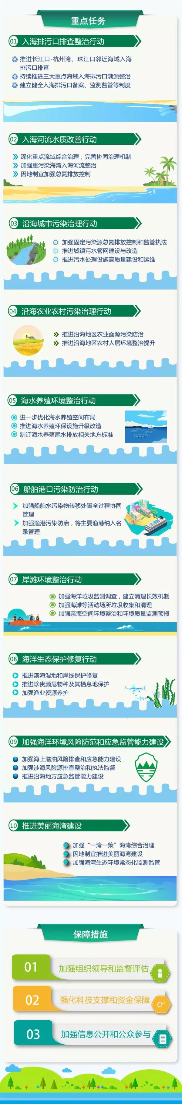 《重點(diǎn)海域綜合治理攻堅(jiān)戰(zhàn)行動(dòng)方案》提出開展:入海排污口排查整治行動(dòng)、入海河流水質(zhì)改善行動(dòng)、沿海城市污染治理行動(dòng)、沿海農(nóng)業(yè)農(nóng)村污染治理行動(dòng)、海水養(yǎng)殖環(huán)境整治行動(dòng)、船舶港口污染防治行動(dòng)、岸灘環(huán)境整治行動(dòng)、海洋生態(tài)保護(hù)修復(fù)行動(dòng)等“七大行動(dòng)”。