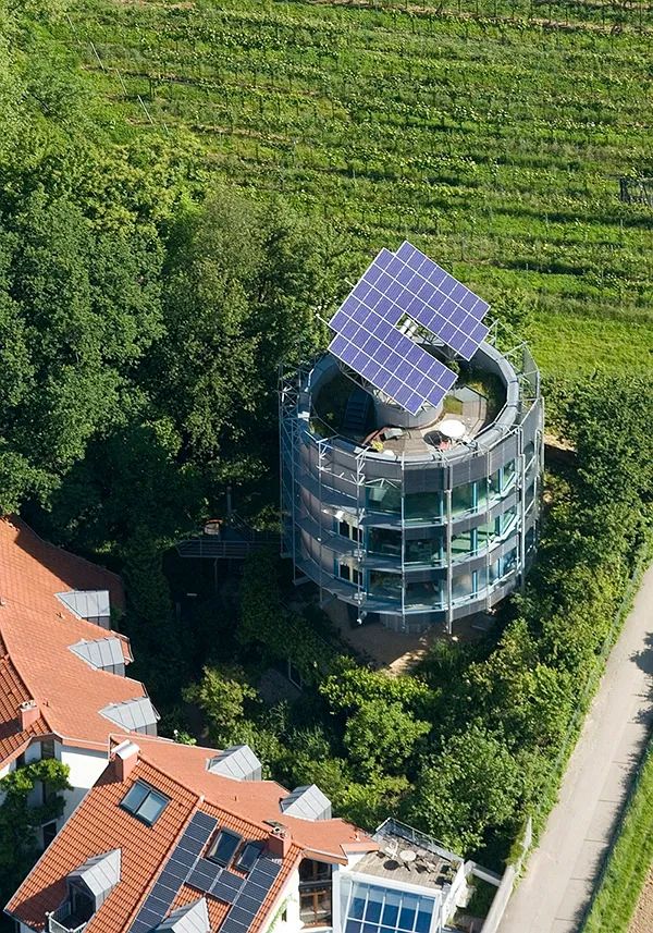 在德國(guó)巴登符騰堡州弗萊堡市內(nèi)有一片綠色的建筑“森林”,包含150棟可以進(jìn)行“光合作用”的再生能源屋。其中一座建筑尤為特別,通過(guò)控制程序,它能夠像向日葵一樣,跟隨太陽(yáng)位置進(jìn)行旋轉(zhuǎn),從而保證屋頂和立面的太陽(yáng)能光電板組最大化地實(shí)現(xiàn)光電轉(zhuǎn)換。