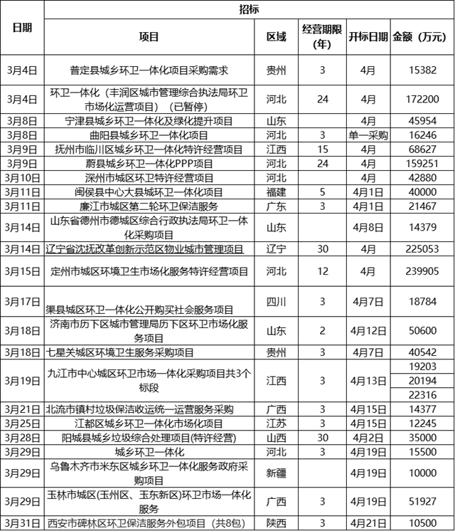 一季度末尾給二季度開(kāi)了一個(gè)好彩頭,雖然3月份只開(kāi)標(biāo)了18個(gè)億級(jí)環(huán)衛(wèi)項(xiàng)目,但卻有23個(gè)過(guò)億項(xiàng)目開(kāi)始招標(biāo),而且這些項(xiàng)目均在4月份開(kāi)標(biāo),總投資達(dá)138億!這也意味著第二季度首月已有百億項(xiàng)目將被收入囊中。