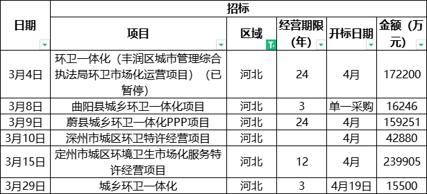 河北環(huán)衛(wèi)市場(chǎng)最瘋狂的并不是已開(kāi)標(biāo)的項(xiàng)目,而是剛剛釋放到市場(chǎng)的6個(gè)億級(jí)招標(biāo)項(xiàng)目,總投資達(dá)65億。其中,僅僅15天時(shí)間就釋放了3個(gè)10億級(jí)項(xiàng)目(其中“豐潤(rùn)區(qū)城市管理綜合執(zhí)法局環(huán)衛(wèi)市場(chǎng)化運(yùn)營(yíng)項(xiàng)目”已暫停后延,后續(xù)情況,中國(guó)固廢網(wǎng)將持續(xù)關(guān)注)。河北一季度億級(jí)環(huán)衛(wèi)市場(chǎng)總規(guī)模接近79億,加上千萬(wàn)級(jí)項(xiàng)目,河北一季度環(huán)衛(wèi)市場(chǎng)總規(guī)模將超過(guò)80億元,迎來(lái)大爆發(fā)!