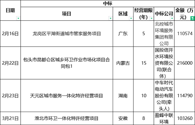 2022年第一季度,盈峰環(huán)境、北控城市服務(wù)、福龍馬、僑銀股份、首創(chuàng)環(huán)境、北京環(huán)境、中國(guó)天楹、中環(huán)潔等眾多龍頭企業(yè)均已拿到億級(jí)環(huán)衛(wèi)項(xiàng)目。雖然3月份看上去有些“倒春寒”,但今年由40家環(huán)衛(wèi)名企爭(zhēng)搶的10億級(jí)環(huán)衛(wèi)項(xiàng)目卻在該月塵埃落定,最終被盈峰環(huán)境全資子公司盈峰中聯(lián)環(huán)境拿到。