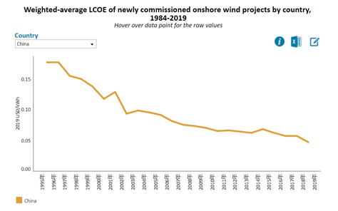 圖 1 1984-2019年中國風(fēng)電平均度電成本