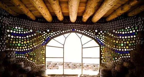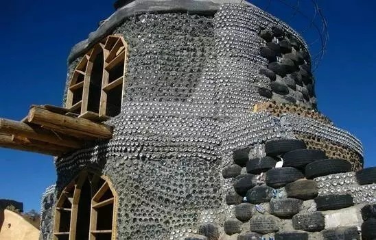 這是美國(guó)建筑師麥克·萊諾茲的作品。他的作品外形千奇百怪,而且都遵循著同一種理念:不需任何外接水電排污系統(tǒng),能夠自己發(fā)電,調(diào)溫,生產(chǎn)食物,收集循環(huán)用水;基本建材全是垃圾,廢棄輪胎、易拉罐、飲料瓶等。他給它們起了個(gè)名字:地球之舟Earthship。圖中的房子用輪胎和瓶子筑成的墻非常厚實(shí),足以抵抗九級(jí)地震。