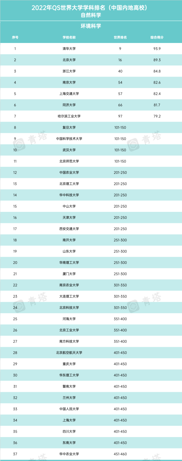 范圍縮小到內(nèi)地高校,按照2022年QS世界大學(xué)學(xué)科排名,中國內(nèi)地高校環(huán)境科學(xué)學(xué)科排名如下: