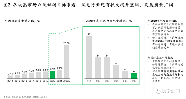 相比之下,當前風電的體量還相對較小——2021年中國風力發(fā)電量占比僅為6.99%,雙碳政策要求風力發(fā)電量占比在2030年達到26%的目標。國際上不少國家的風力發(fā)電占比已經很高,例如丹麥風力發(fā)電量占比達到了48%,英國、德國也都超過了20%(見圖2)。